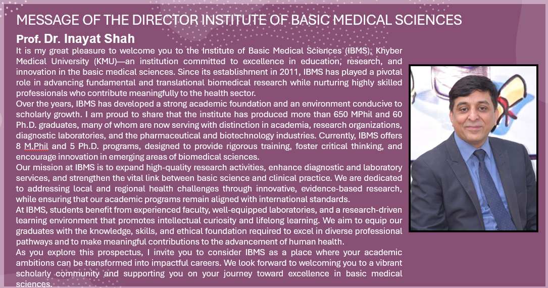 The institute of Basic Medical Sciences is a constituent part of KMU that specializes in cutting edge basic sciences and translational research. In addition to fixing focus on faculty development, research and technology and bringing it at par with international standards, the areas of interest /concern of IBMS would remain the following:-